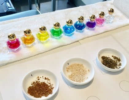 | 講座内容 | ①五感における色の役割 ②色彩感情の成り立ち ③赤・黄・青の色彩心理 ④香りについて 白檀・桂皮・大茴香・丁子 ⑤体験セミナーの手順 ・名刺香 ・財布香 | ①色の三原色 ②青と緑の境界線 ③橙・緑・紫の色彩心理 ④ジャパニーズ・メディカル・アロマテラピー ⑤様々なお香のカタチ ⓺香りについて 甘松・かっ香・龍脳・山奈 ⑦体験セミナーの手順 ・魔から身を護る塗香 ・チャクラバランス塗香 | ①色相環と波長 ②アンダーネガティブとオーバーネガティブ ③藍・白・ピンクの色彩心理 ④お香の形状による使い方の違い ⑤香りについて ・伽羅と沈香 ・乳香・安息香・じゃ香・貝香・零陵香・排草香・うこん ⓺香りの表現 ⑦体験セミナーの手順 ・型抜き香 ・線香・コーン香 |