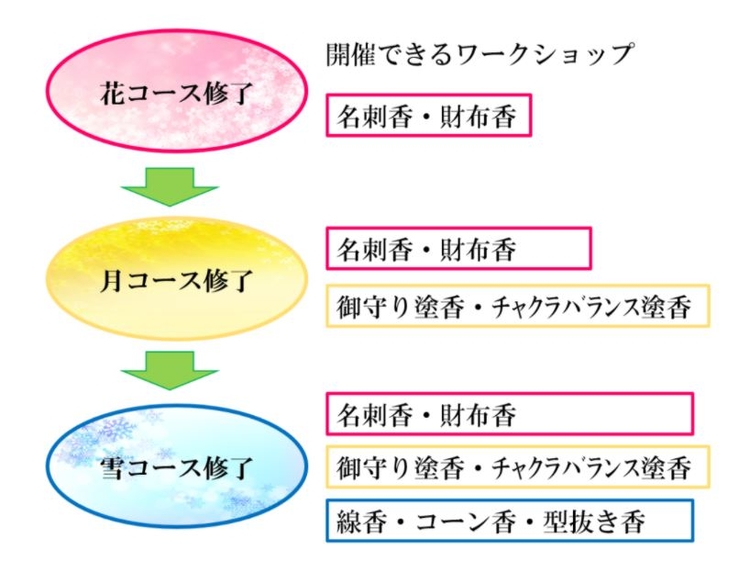 | 講座内容 | ①五感における色の役割 ②色彩感情の成り立ち ③赤・黄・青の色彩心理 ④香りについて 白檀・桂皮・大茴香・丁子 ⑤体験セミナーの手順 ・名刺香 ・財布香 | ①色の三原色 ②青と緑の境界線 ③橙・緑・紫の色彩心理 ④ジャパニーズ・メディカル・アロマテラピー ⑤様々なお香のカタチ ⓺香りについて 甘松・かっ香・龍脳・山奈 ⑦体験セミナーの手順 ・魔から身を護る塗香 ・チャクラバランス塗香 | ①色相環と波長 ②アンダーネガティブとオーバーネガティブ ③藍・白・ピンクの色彩心理 ④お香の形状による使い方の違い ⑤香りについて ・伽羅と沈香 ・乳香・安息香・じゃ香・貝香・零陵香・排草香・うこん ⓺香りの表現 ⑦体験セミナーの手順 ・型抜き香 ・線香・コーン香 |